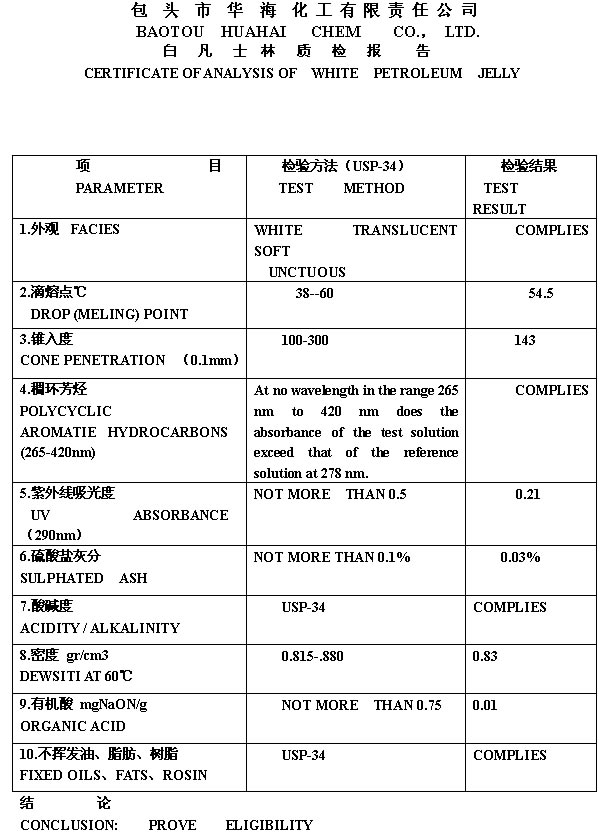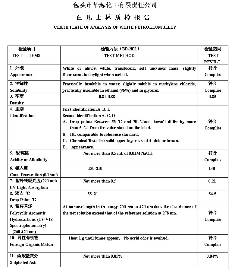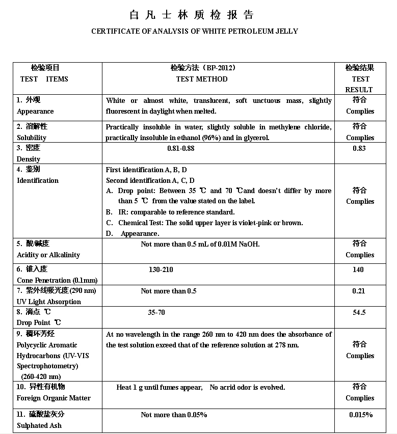 WHITE PETROLEUM JELLY白凡士林质检报告BP2012