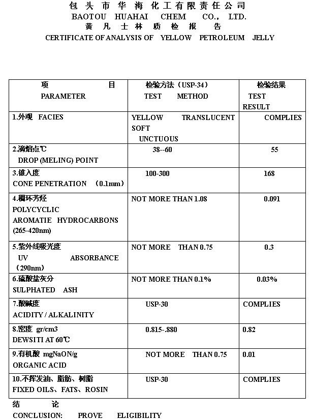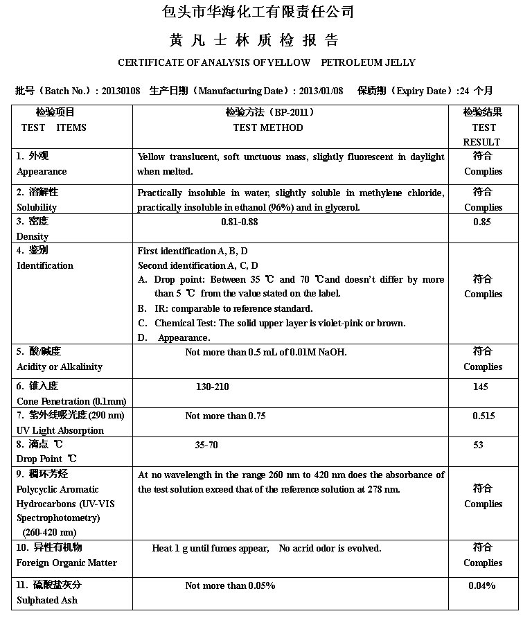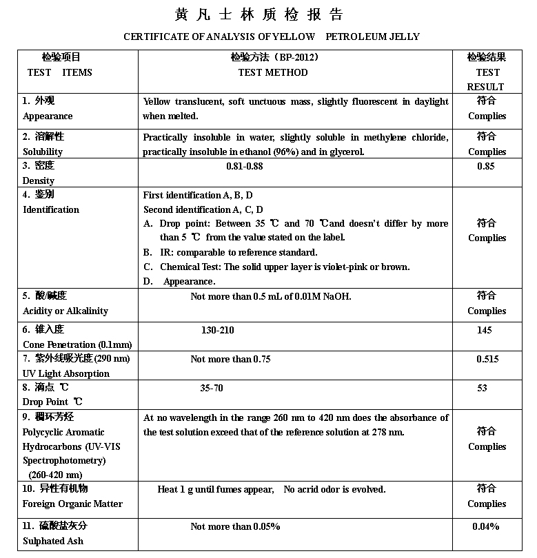 YELLOW PETROLEUM JELLY黄凡士林质检报告BP2012
