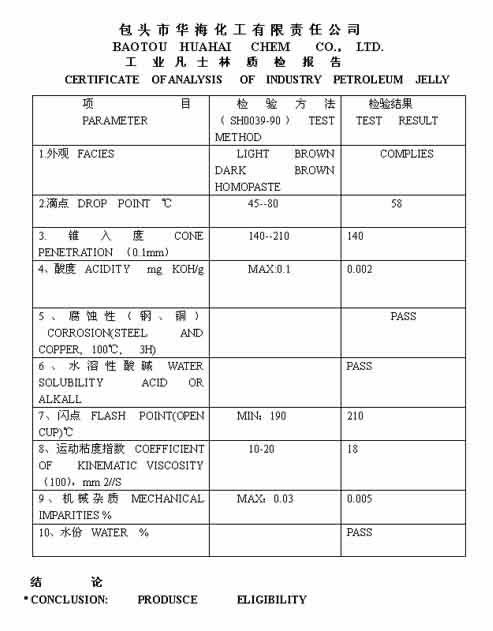SH0039-90工业凡士林质检报告CERTIFICATE OF ANALYSIS